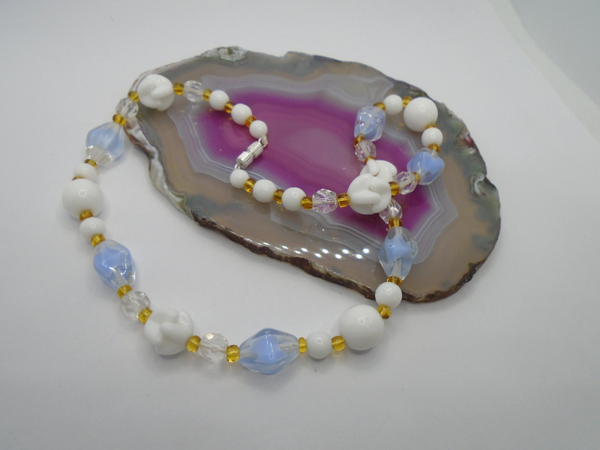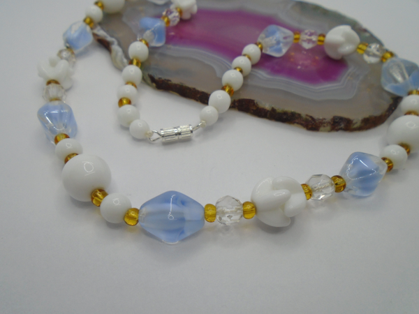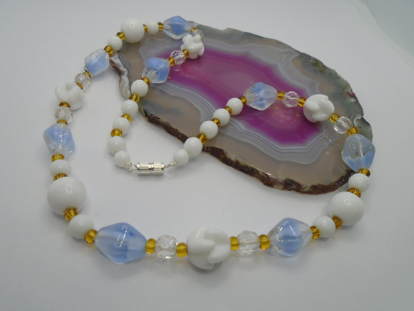 Vintage 1950's Blue Givre and White Milk Glass & Amber Seed Beads Necklace .