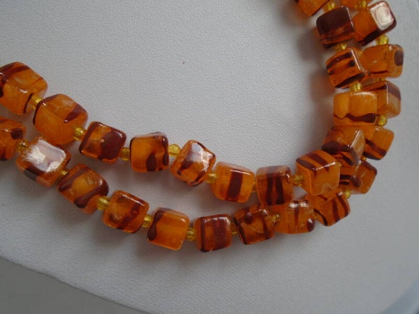Vintage Eye - Catching Gold & Brown Round and Square Celluloid Bead Necklace.