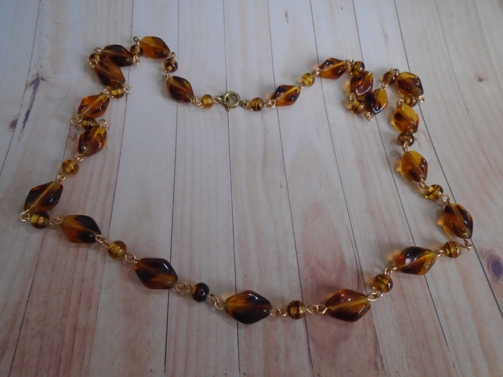 Vintage Stunning Striped Black and Amber Tiger Glass Bead Chain Linked Necklace.