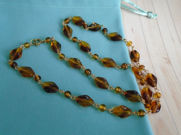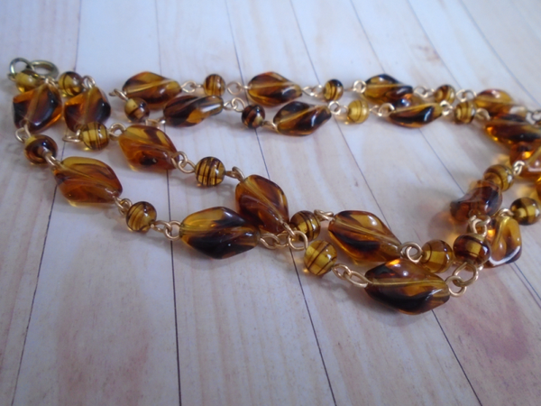 Vintage Stunning Striped Black and Amber Tiger Glass Bead Chain Linked Necklace.