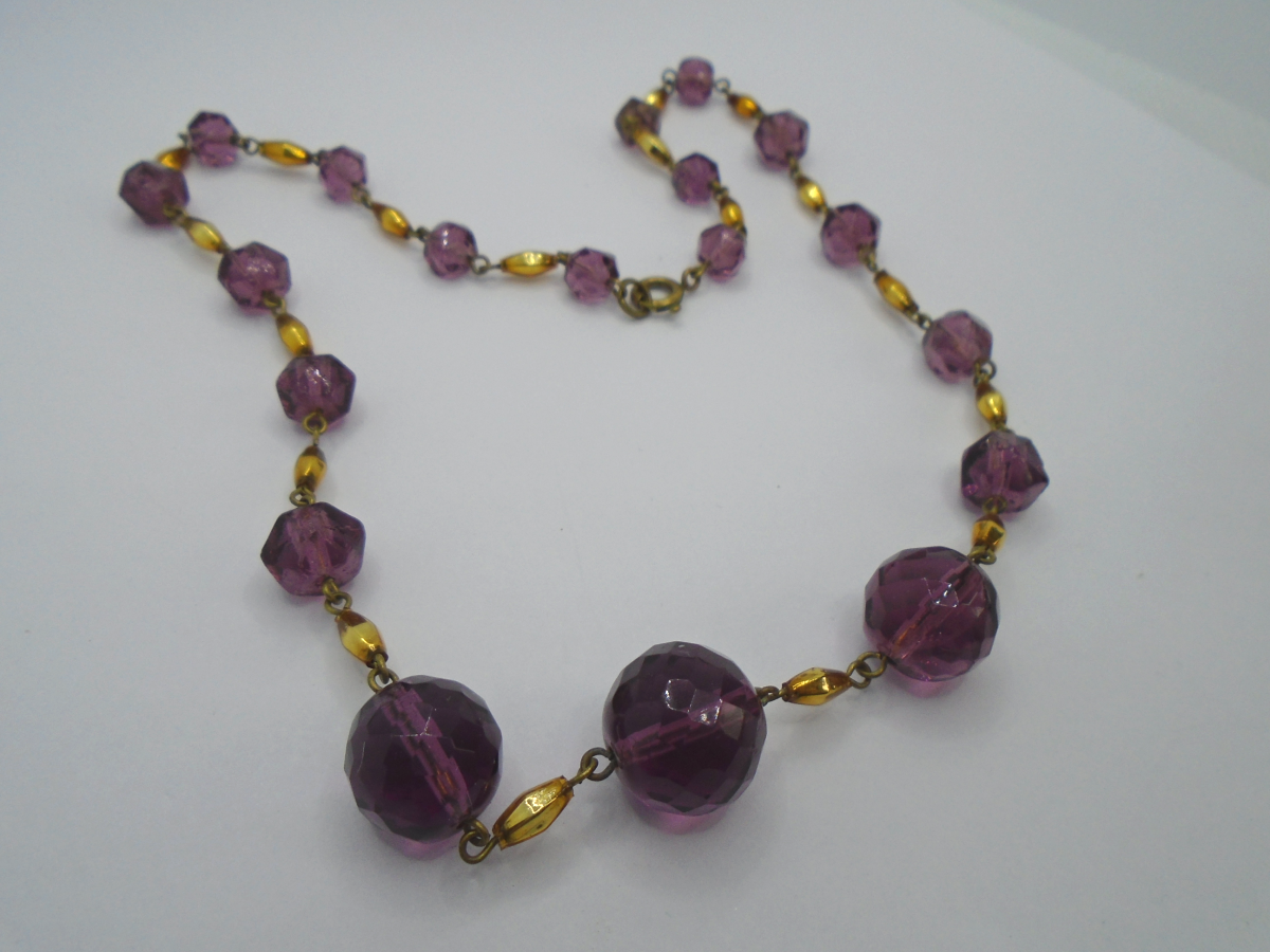 Pretty Vintage Art Deco Faceted Amethyst Glass & Gold Bead Metal Links Necklace. (Copy)