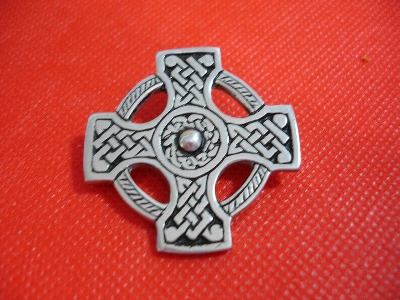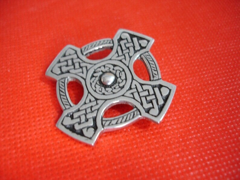 Pewter Brooch St Justin Cornwall Circular Celtic Shield In Original Box.