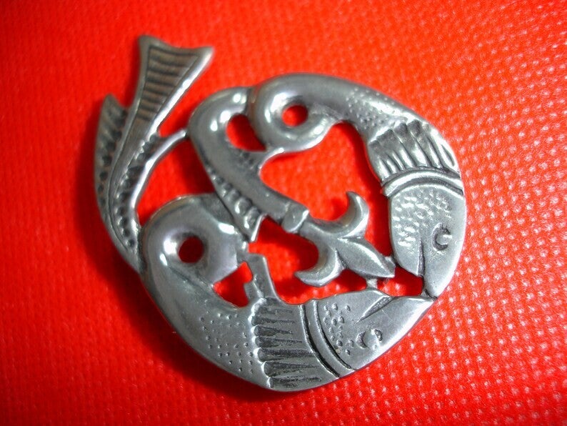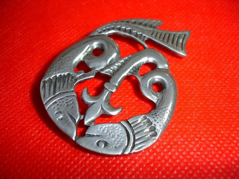 This is a lovely vintage rare Fish Celtic Pewter Brooch by SCJ Made in Cornwall. With 2 Fish in an open design brooch