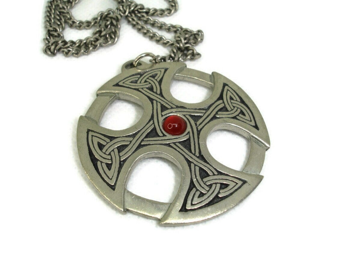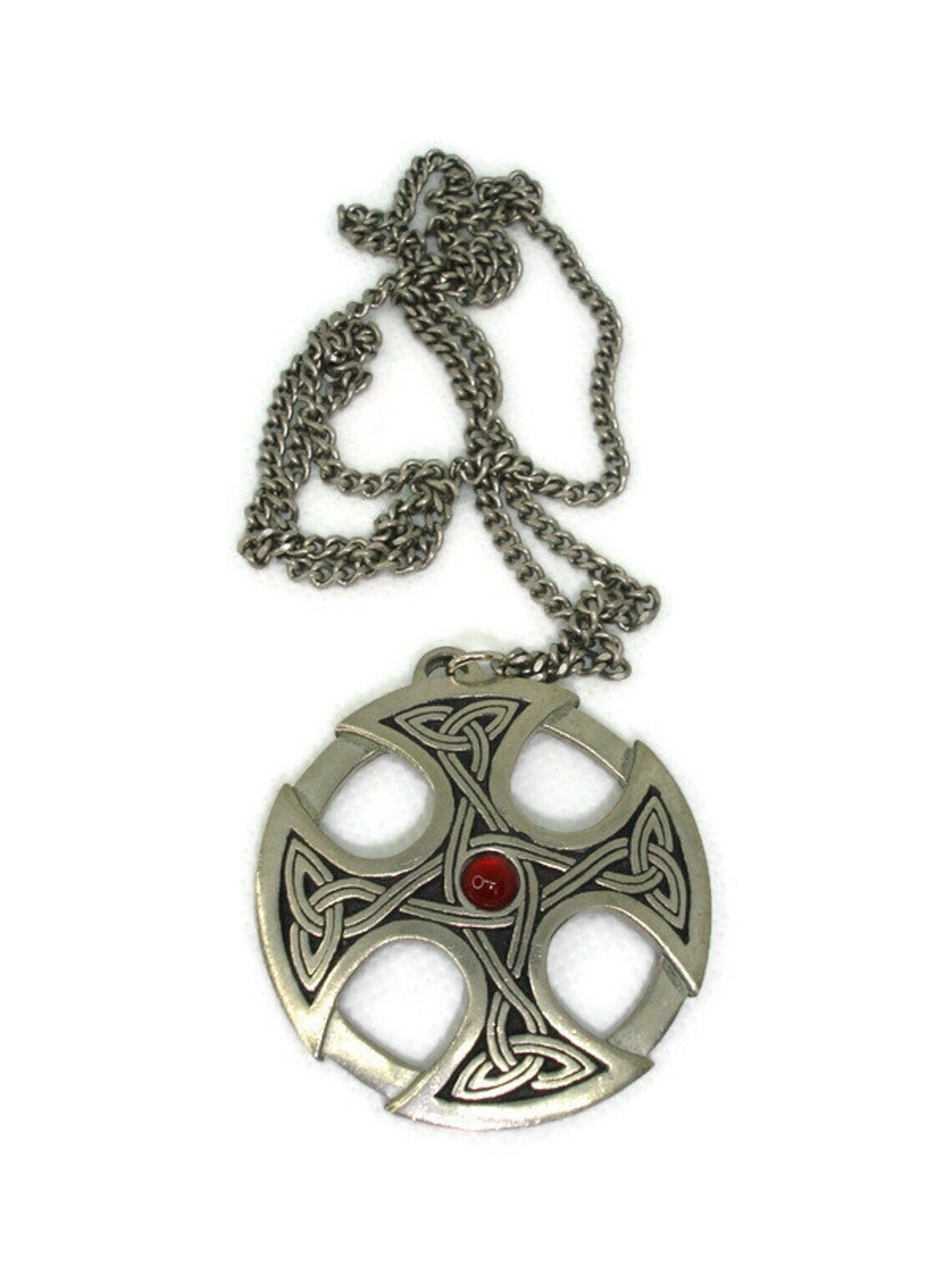 Large Celtic Pewter Pendant / Necklace - Long Chain. Signed by St. Justin of Cornwall. 1994 The pendant is approx. 50mm round a red stone in the middle Supplied in a gift red velvet Bag. used but like new