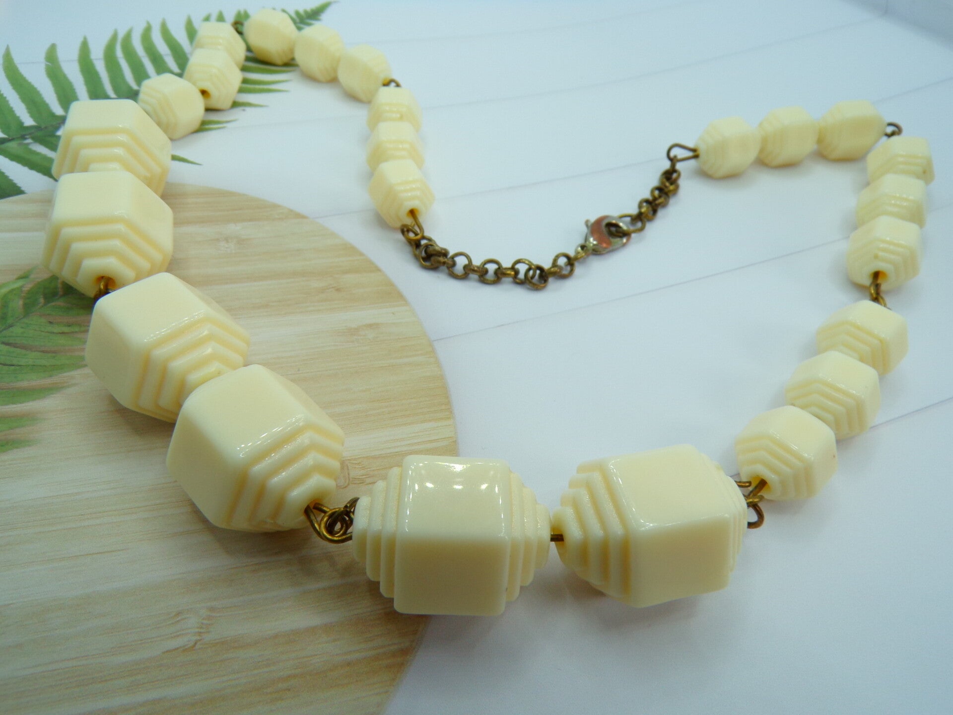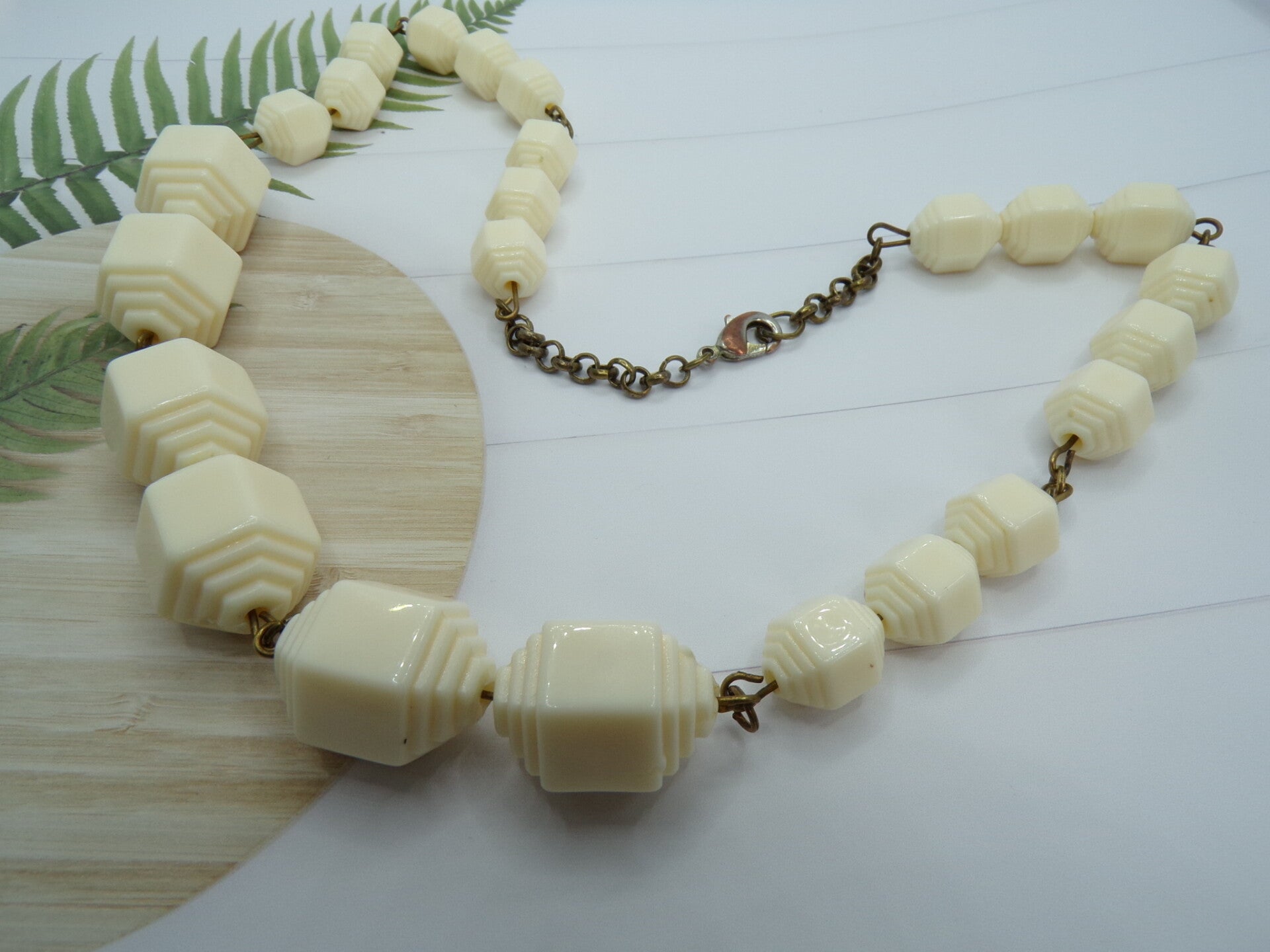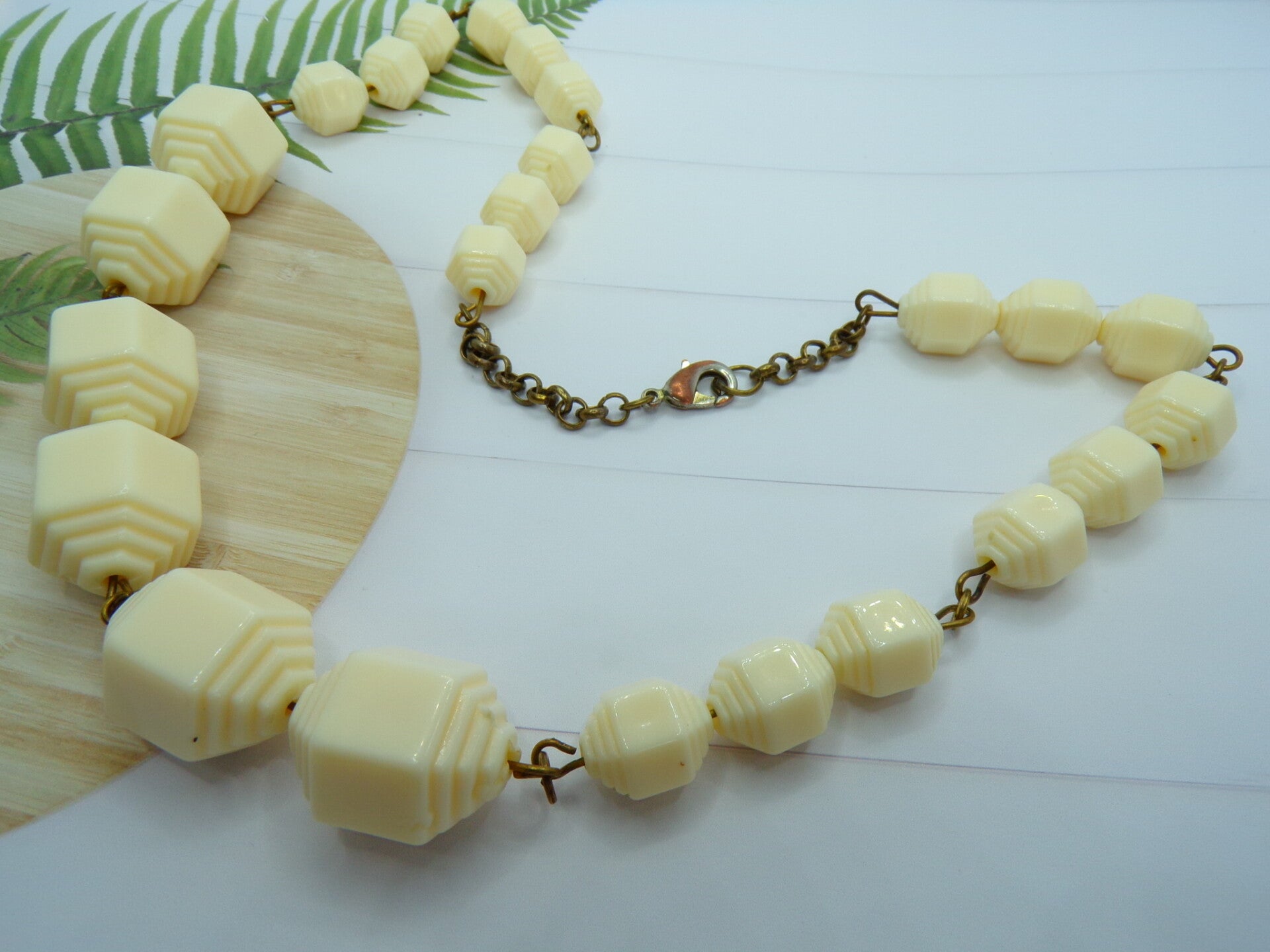 Vintage Hand Strung Linked Cream Lucite Geometric Beads Necklace.