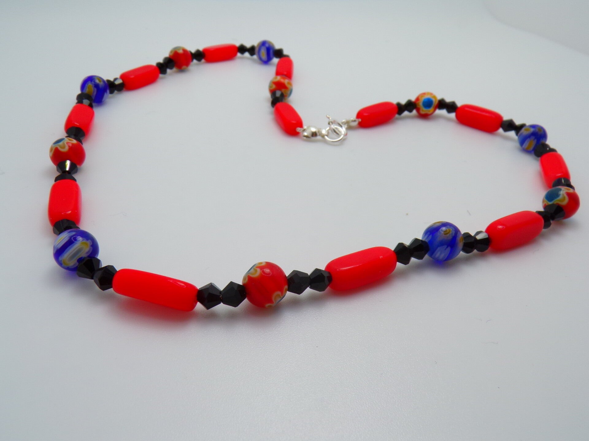 Vintage Style Red & Blue Millefiori Glass Necklace Made By Preloved Jewellery.
