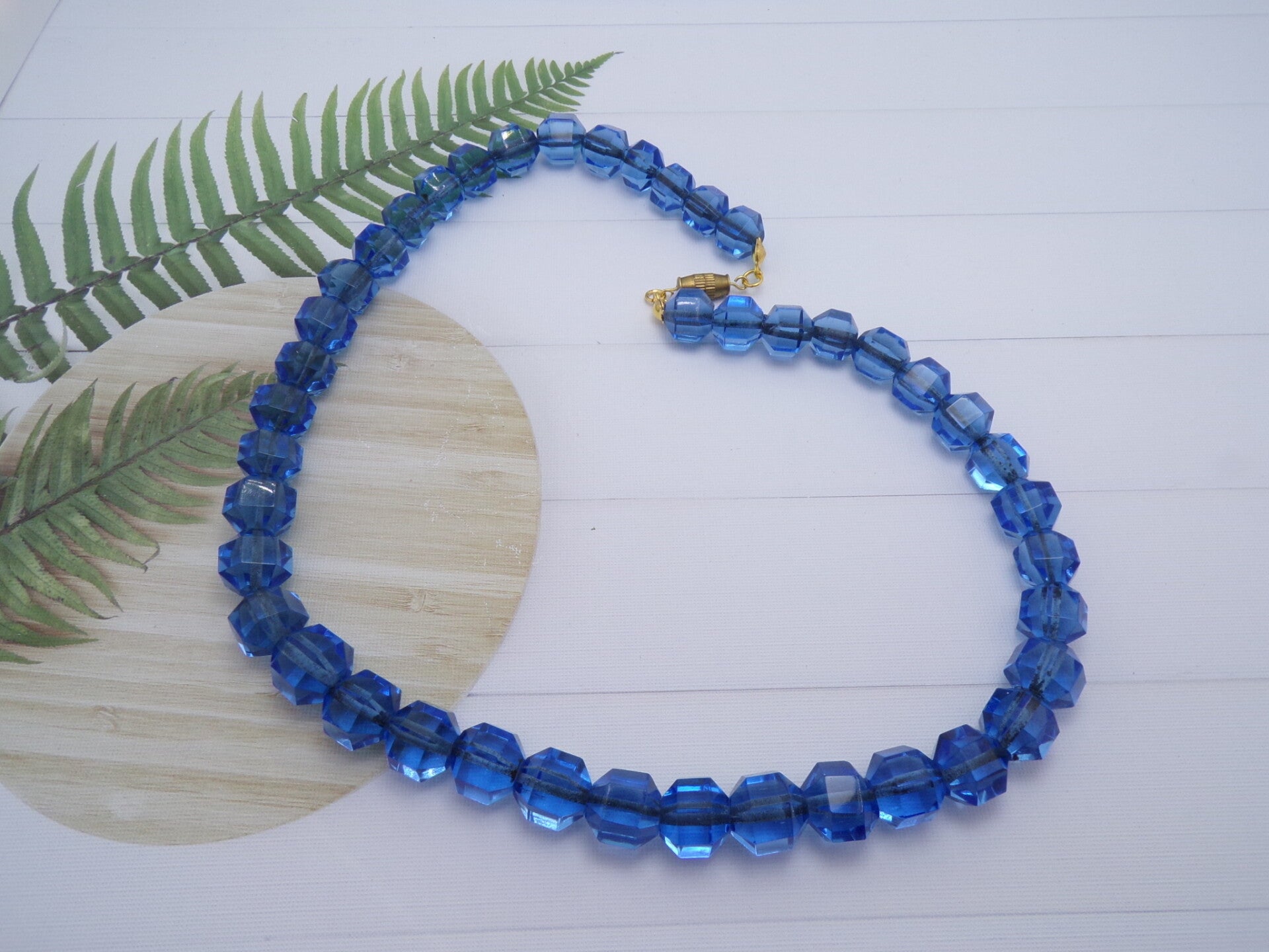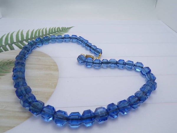 Vintage Blue Crystal Faceted Cube Bead Necklace.