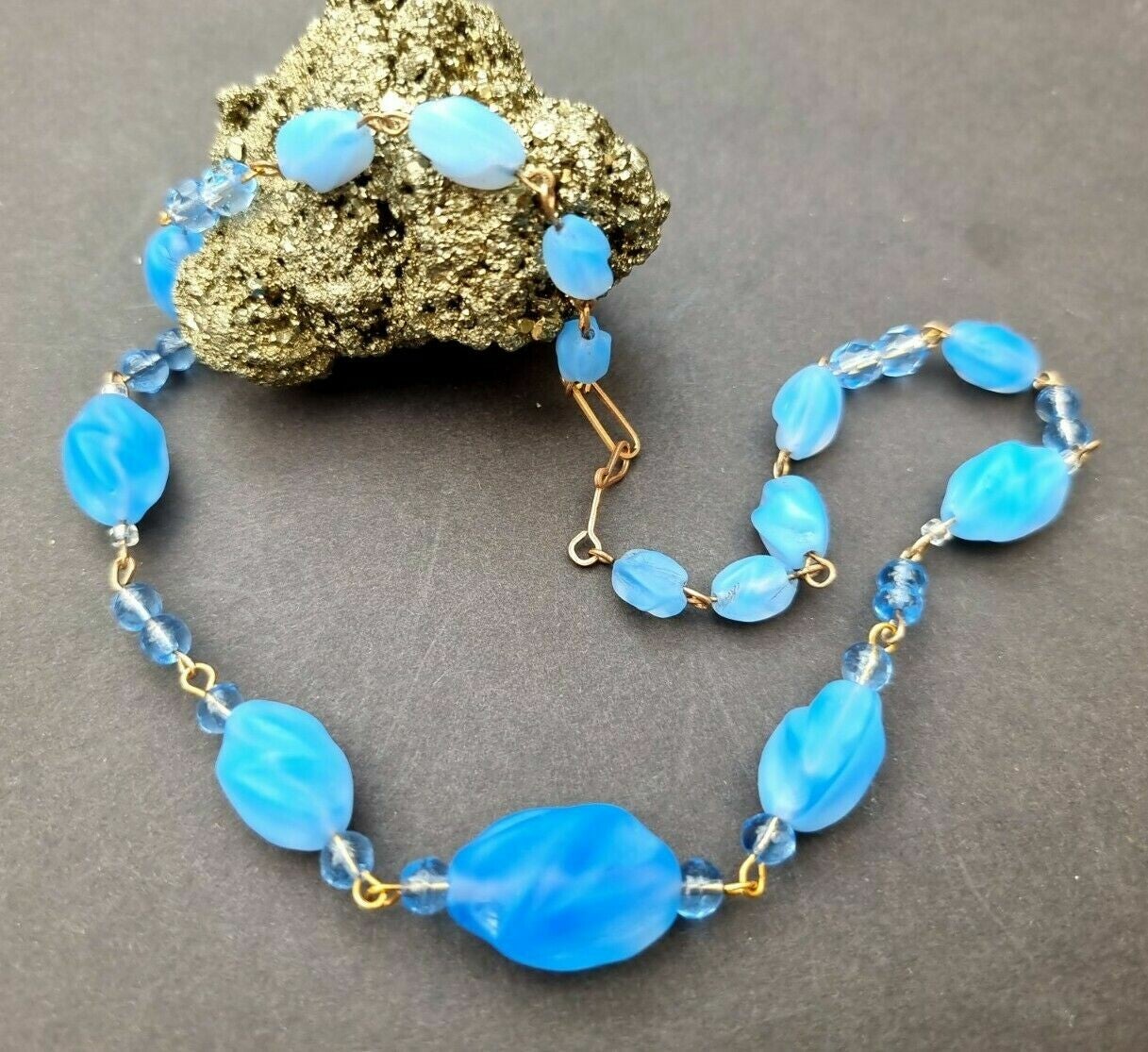 Vintage Art Deco Blue Pinched Twisted Opaque Opal Glass Bead Hand Wired Necklace.